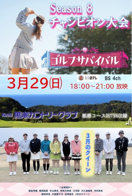 2026年03月18日 こんにちは😃 🐳かんくろうです。BS日テレの人気番組『ゴルフサバイバル』のSEASON8 チャンピオン大会が放映されます😍こちらは先日、Kochi黒潮CC 黒潮コース OUT9ホールで収録していただきました😁若手女子プロゴルファーの超絶プレー、あふれる笑顔、悔し涙など見どころ満載です🤗放映はBS日テレ BS4ch3月29日㈰ 18:00~21:00ぜひ、ご覧ください😉 黒潮CCのWEB予約はこちらから